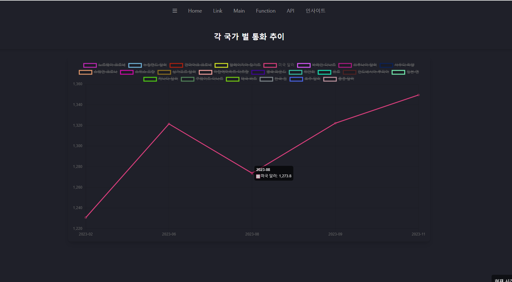 밑에 결과는 Tailwind css를 이용해서 1년간 국가 별 통화 추이를 Line 그래프를 통해 시각화 시켰다.
